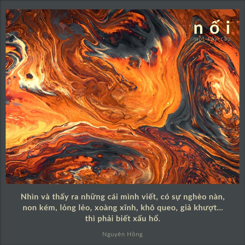 Trong công việc viết văn, là nghề văn, điều tôi đặt lên hàng đầu để luôn luôn tự nhắc nhủ, răn bảo mình là: không được bằng lòng mình đặc biệt là không được cho phép mình gian dối. Với những tác phẩm vừa viết xong cũng như viết đã lâu, tôi đều lấy làm những cái mốc để mình phải cố gắng hơn nữa, đổ mồ hôi, sôi máu mắt hơn nữa. Nhìn và thấy ra những cái mình viết, có sự nghèo nàn, non kém, lỏng lẻo, xoàng xĩnh, khô queo, giả khượt… thì phải biết xấu hổ. Nhưng đã nhìn nghèo nàn, non kém, khô queo, giả khượt mà vẫn cứ viết cho có trang chữ in thành bài thành tập sách, để có sách có tên, có tiền thì đó là quá đỗi hư hỏng.