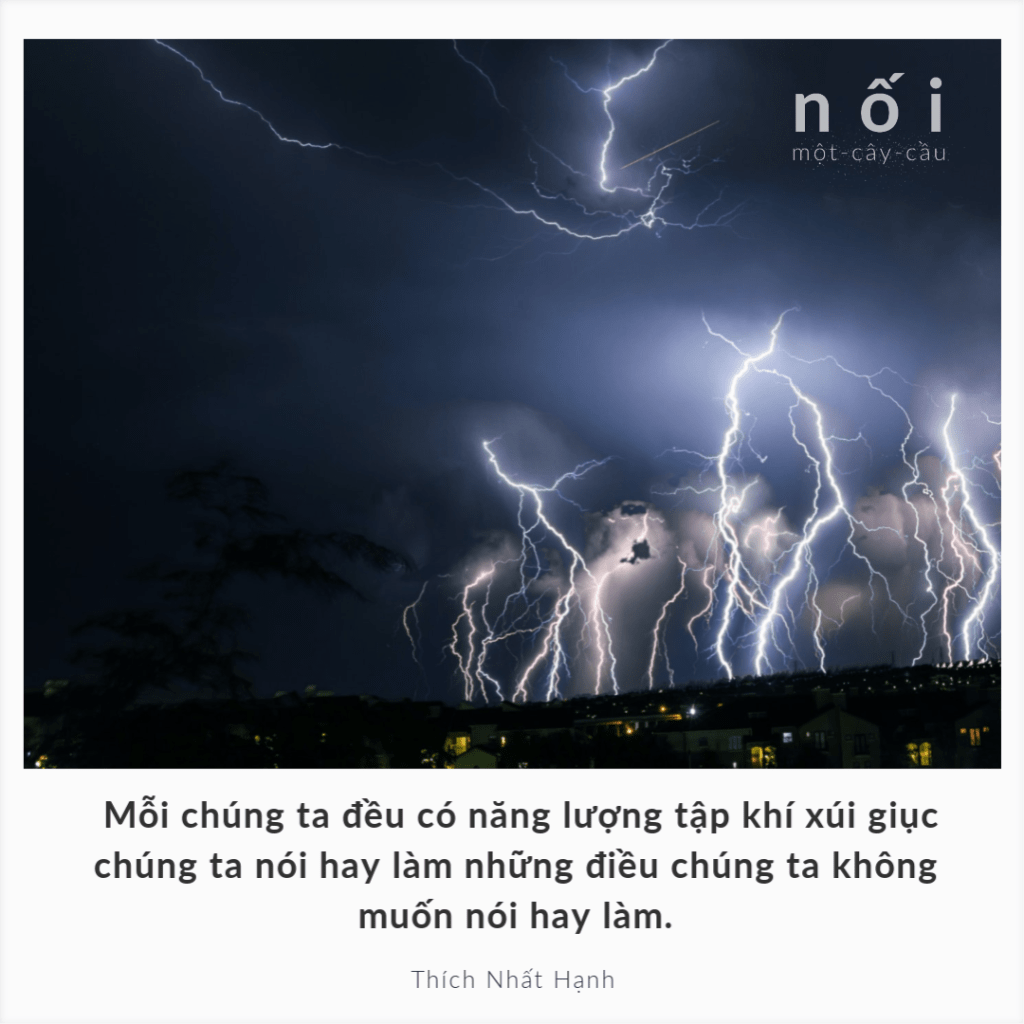 Có một thứ năng lượng rất mạnh trong mỗi chúng ta, gọi là năng lượng của tập khí. Vasana là chữ Sanskrit để chỉ tập khí. Mỗi chúng ta đều có năng lượng tập khí xúi giục chúng ta nói hay làm những điều chúng ta không muốn nói hay làm. Những năng lượng tập khí ấy gây tổn hại cho ta và cho sự liên hệ giữa ta và những người khác. Ðứng về phương diện trí thức, ta biết rằng nói hay làm một điều gì có thể gây đau khổ, ấy thế mà ta vẫn nói hay làm điều ấy. Và một khi đã nói hay làm, là bạn đã gây tổn hại rồi. Thế rồi bạn hối tiếc. Bạn đấm ngực và bứt tóc. Bạn nói: “Tôi sẽ không nói hay không làm điều ấy nữa đâu.” Thế nhưng, mặc dầu bạn nói điều này với tất cả sự thành thật, lần kế tiếp, khi gặp hoàn cảnh ấy, bạn lại nói và làm điều giống hệt như vậy. Ðó là sức mạnh của năng lượng tập khí, mà có thể cha mẹ hay tổ tiên đã truyền lại cho bạn.