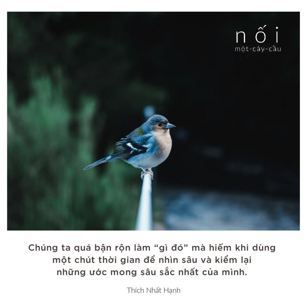 Chúng ta ít khi tự tặng cho mình đủ thời gian và không gian để nghiền ngẫm rằng: Mình có đang làm những gì mà mình muốn làm nhất trong đời mình không? Hay mình có biết đó là điều gì chưa? Tiếng ồn trong đầu và xung quanh chúng ta đã át đi những tiếng nhỏ nhẹ bên trong. Chúng ta quá bận rộn làm “gì đó” mà hiếm khi dùng một chút thời gian để nhìn sâu và kiểm lại những ước mong sâu sắc nhất của mình.